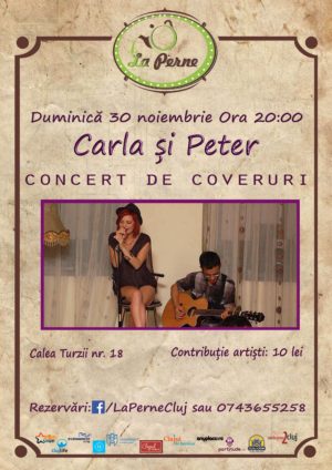 Carla și Peter Data30 nov. Dum 20:00Access10 leiLocLa Perne Cluj-NapocaComentarii0Trackbacks0 Duminică, 30 Noiembrie 2014, începând cu ora 20:00, La Perne Cluj-Napoca te invită la un concert de coveruri alături de Carla și Peter. Tweet