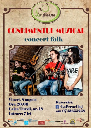 Condimentul Muzical Data08 aug. vin 20:00AccessgratuitLocLa Perne Cluj-NapocaComentarii0Trackbacks0 Vineri, 8 August 2014, începând cu ora 20:00, La Perne Cluj-Napoca te invită la un concert susținut de trupa Condimentul Muzical. Tweet