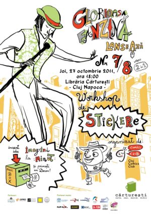 Lansarea Glorioasei Fanzine va avea loc în Librăria Cărtureşti (Cluj-Napoca – în Iulius Mall), joi 27 octombrie, ora 18:00. Cu prilejul lansării, Cluj Comics Club va organiza un workshop de stickere. Pornind de la schiţe pe autocolant, participanţii vor învăţa să creeze personaje de bandă desenată într-un mod uşor şi distractiv. Apoi fiecare va putea să dea viaţă propriului scenariu de banda desenată! Nu e nevoie să ştiţi desena pentru a vă amuza împreună cu noi! Cluj Comics Club este numele dat unui grup de oameni pasionaţi de bandă desenată – începători, amatori şi profesionişti. Constituit în 2010 în urma unui workshop de bandă desenată organizat de Centrul Cultural German şi Universitatea de Arte şi Design, Clubul se întruneşte o dată pe săptămână în biblioteca Centrului Cultural German. Lucrăm, povestim, învăţăm, ne jucăm, totul pe marginea ideii de bandă desenată. Acest workshop este primul eveniment marca Cluj Comics Club, şi ne propunem să fim tot mai prezenţi în viaţa culturală a Clujului.
