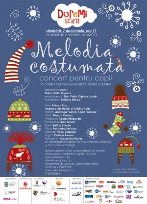 Sâmbătă, 7 Decembrie 2013, începând cu ora 17:00, în studioul de concerte din cadrul Academiei de Muzică Gheorghe Dima Cluj-Napoca va avea loc concertul Melodia costumată, realizat în parteneriat cu Societatea Română Mozart, în cadrul Festivalului Mozart, ediţia a XXIII-a.