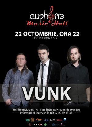 Sâmbătă, 22 Octombrie, începând cu ora 22, Euphoria Music Hall te invită la un concert Vunk.