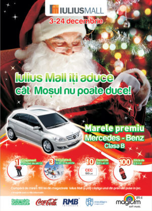Forfota sărbătorilor de iarnă a început în Iulius Mall! Un Mercedes-Benz a fost bine legat de sania Moşului, iar renii trag din greu premiile: excursii în Austria, echipamente complete de ski, cecuri de cumpărături şi alte surprize plăcute! Clienţii care cumpără din Iulius Mall cadourile celor dragi au parte doar de bucurii pentru că, în 2010, Moşul le aduce cât nu pot duce!